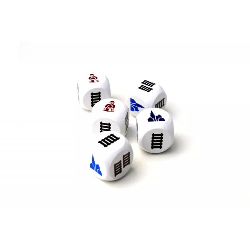 Players take turns throwing five white dice. Entitled to one roll, the player must assemble the combination he needs from single or double paths. The images of stations on the dice mean nothing more than the right to place a station, and the locomotive is a joker, or the right to take on a new task. Unused dice in their turn, players can exchange for tokens with images of the same paths (single or double). The exchange is carried out at a rate of 1 to 2 (two dice with a single path can be exchanged for one similar token). Tokens can be added to your hand in subsequent turns.