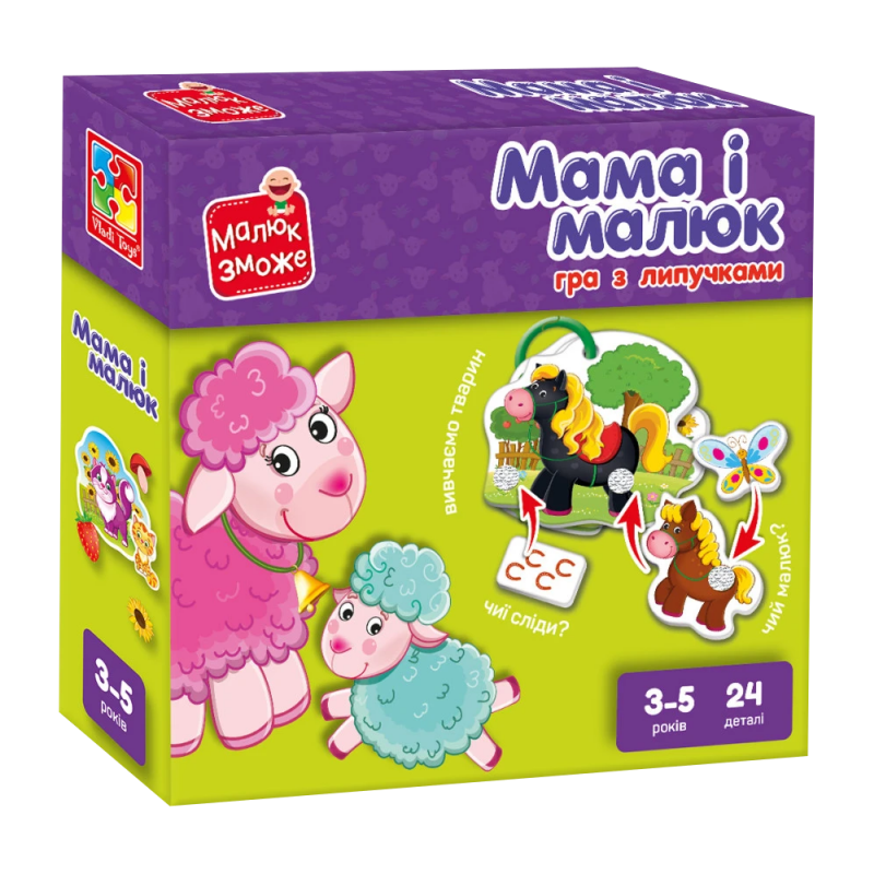 Що робити? Роздивіться усі картки з дорослими тваринами. Визначте, як виглядають їхні дитинчата і прикріпіть їх поруч за допомогою липучок. Коли усі дітки знайдуть своїх мам, закріпіть картки на кільці. Беріть їх з собою на прогулянку. Також в інструкції є тематичні віршики і загадки, які будуть цікаві млюкам.