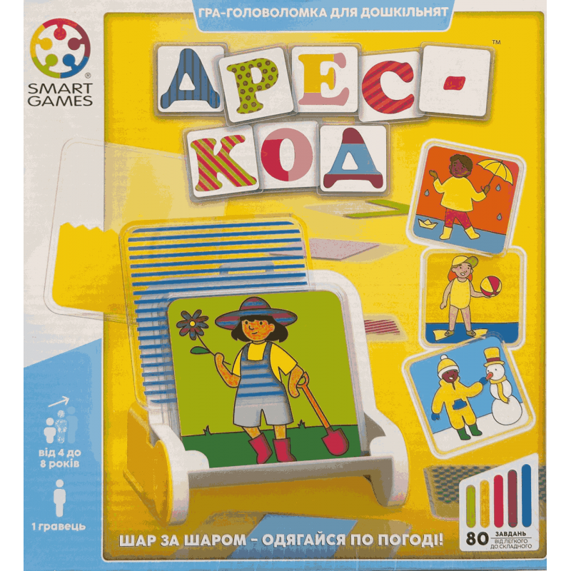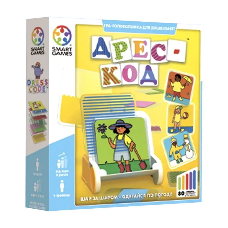 Дрес-Код – швидка дитяча соло-гра, що спрямована на розвиток концентрації уваги, планування, пошуку рішень, просторового та візуального сприйняття. Ця кольорово-візерункова головоломка прийдеться до вподоби як дівчатам, так і хлопчикам. Проста і яскрава, вона обов'язково їх зацікавить, тож це чудовий вибір для тих, хто хоче подарувати дитині щось цікаве й корисне водночас.