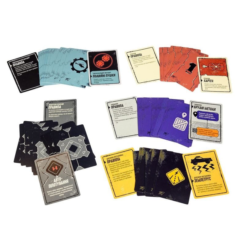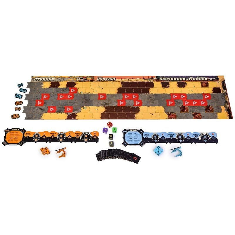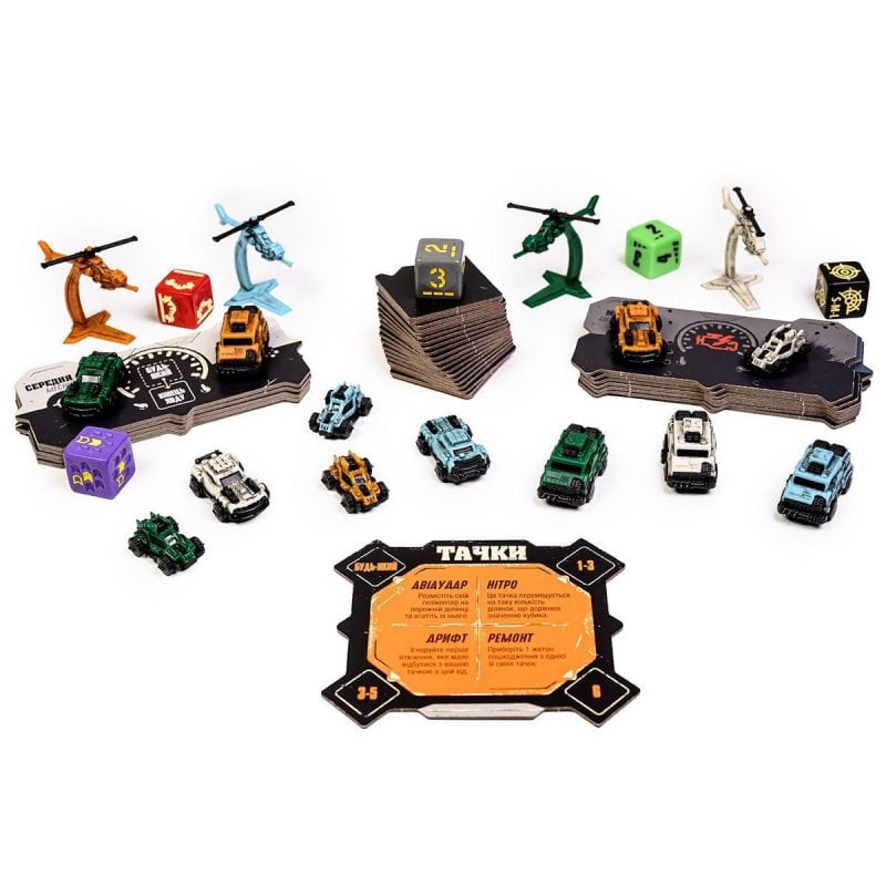 Комплектація | 4 командні планшети; 12 панелей приладів; 12 машин; 4 гелікоптери; 16 кубиків руху; 1 кубик дороги; 1 кубик трюку; 1 кубик стрільби; 1 кубик удару; 1 кубик напряму; 5 плиток дороги (двосторонніх); 1 плитка фінішної межі (двостороння); 20 жетонів пошкоджень; 26 жетонів небезпеки; 4 фігурки уламків; правила гри. |