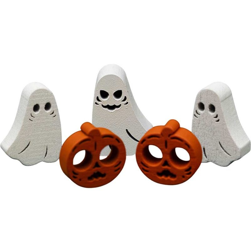 | Комплектація | 36 тайлів будинків (по 9 тайлів 4 кольорів); 28 звичайних карт-схем; 20 двобічних карт-головоломок; 8 примарних карт-схем; 4 карти-пам’ятки гравців; 4 фішки привидів; 10 дерев’яних жетонів жаху (-1 переможний бал кожен); 5 картонних жетонів жаху (-2 та -3 переможні бали); 20 жетонів дітей (по 5 жетонів 4 кольорів); правила гри. |
