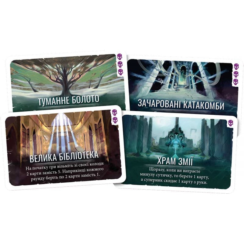 В коробці знайдемо два набори з 32 карт персонажів (16+16), картки локацій і пам’ятки, а також значну купку розмаїтих жетонів. Тож почати просто: візьміть свою колоду з 16 карт, ретельно перетасуйте й доберіть звідти 5 карток. Решту компонентів покладіть на столі так, щоб і ви, і ваш суперник вільно могли до них дотягнутися. Ось і все — початок партії простої й глибокої гри покладено!