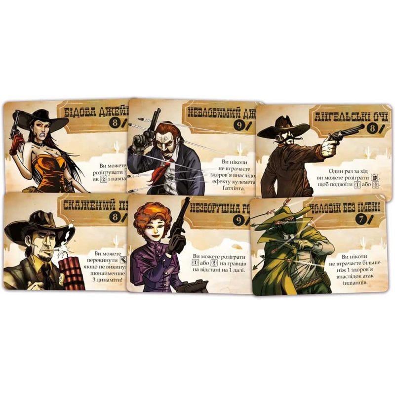 - стріла. На вас напали індіанці. Не чекаючи закінчення серії кидків, ви маєте взяти з резерву стільки стріл, скільки випало на кубиках. Якщо ви взяли останню стрілу, всі гравці включно із вами скидають стріли в резерв і отримують поранення в кількості, що дорівнює скинутим стрілам;