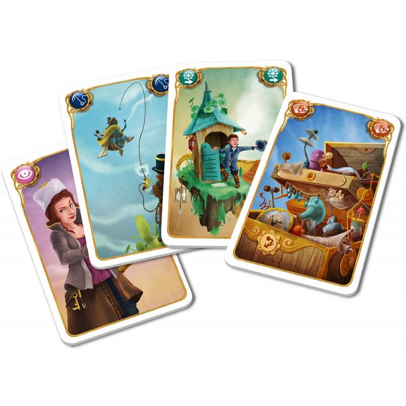 Комплектація | Базова гра: 78 карт скарбів; 1 повітряне судно зі змінними елементами; 6 фішок шукачів пригод; 6 жетонів шукачів пригод; 9 овальних плиток міст; 4 кубики загроз; 4×2 карт підсилення; 68 карт спорядження: 20 синіх компасів, 18 жовтих блискавичників, 16 червоних клаксонів, 14 чорних гармат; 8 карт прискорення; 1 книга правил. Доповнення № 1: 14 карт спорядження «Більші можливості»; 8 карт «Покращене спорядження»; 6 карт шукачів пригод; 4 карти підсилення. Доповнення № 2: 4 карти «Човен»; 6 карт підсилення; 1 човен. Бонус: 1 плитка міста Ялинвіль; 1 плитка міста Вільнокрай; 1 плитка міста Боскалумія; 2 карти «Якір-кішка»; 2 карти «Інструктор». |