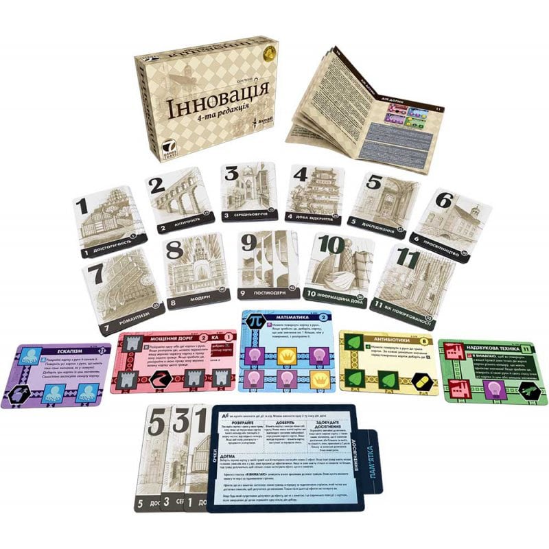 «Інновація» — карткова гра про відкриття, ідеї й винаходи, що зможуть вплинути на хід історії. На початку партії, звісно, й колесо винайти буде кожному за щастя. А от до чого призведе нестримна жага розвитку, залежить тільки від вашої стратегічної думки, бо тут не звикли покладатися на сам лише талан!