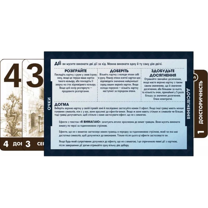 Як ми вже згадували тут, картки різняться за кольором і приналежністю до тої чи іншої епохи. Але загалом кожна з них унікальна, бо має власні ефекти догми. Хто знає, до чого вони призведуть? Ефекти-вимоги спрямовані на суперників. Ефекти, що не є вимогою, рухають уперед ваш прогрес.