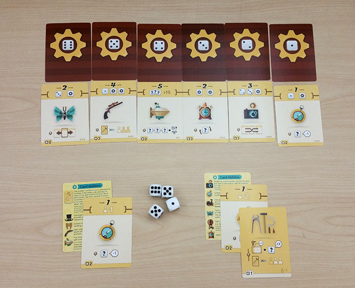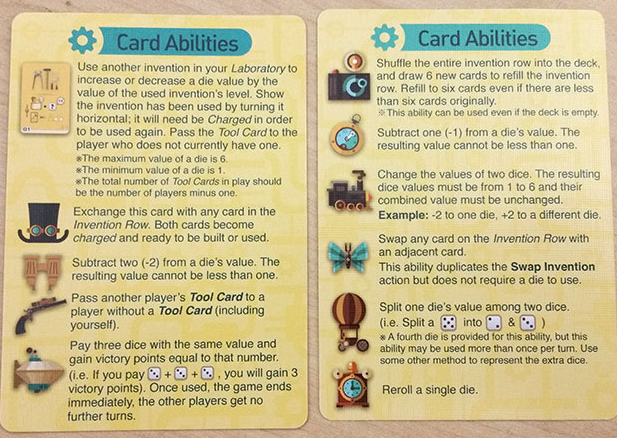 Карти значень кубиків та довідкові карти досить зрозумілі, але корисно приділити трохи часу, щоб розглянути оформлення та здібності різних карт Винаходів та Інструментів.
