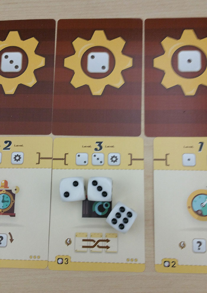 Наприклад, у одній грі, в яку я грав, у ряді Винаходів з’явилася карта кінця гри, і я дуже хотів її отримати. Зазвичай, щоб здобути таку карту, потрібно набрати суму більше 15 на всіх трьох кубиках. Я не кинув таку високу суму, але у мене був Винахід, який я побудував, і який дозволяв поміняти цю карту з будь-якою іншою у Ряді Винаходів. Тож я поміняв карти місцями і здобув карту кінця гри.