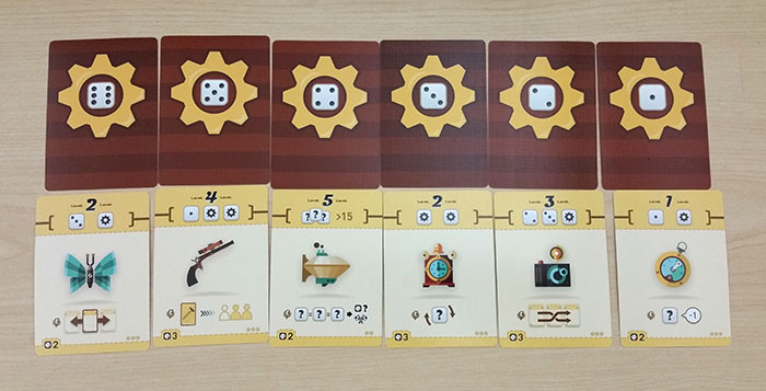 На початку гри карти значень кубиків викладаються поруч одна з одною у порядку спадання зліва направо. Потім карти Винаходів перемішуються, і під кожною картою значення кубика кладеться одна карта Винаходу обличчям угору. Решта карт Винаходів викладається обличчям вниз у колоду поруч із щойно створеним рядом Винаходів.
